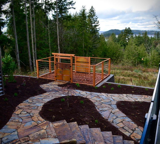 Matching drystack stone walls, flagstone paths & stone steps carry though the site with views of the Chuckanut foothills. A minimalist style wire fence design for the garden and pet area keep light and visibility open. With planting areas filled with predominantly native vegetation.